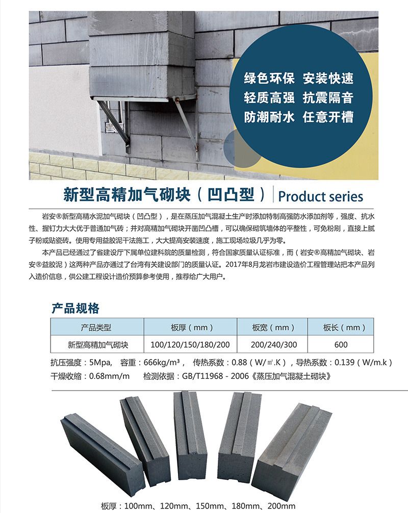 新型高精加氣砌塊凹凸槽設(shè)計(jì),安裝工藝簡(jiǎn)單快速。可任意開(kāi)槽(水電管線安裝方便)、切割調(diào)整寬度、長(zhǎng)度,可在任意部位釘釘、鉆孔、安膨脹螺栓,單點(diǎn)吊掛力在50公斤以上。粘貼性強(qiáng),免再粉刷,可直接上膩?zhàn)印①N瓷磚,大大縮短工期。